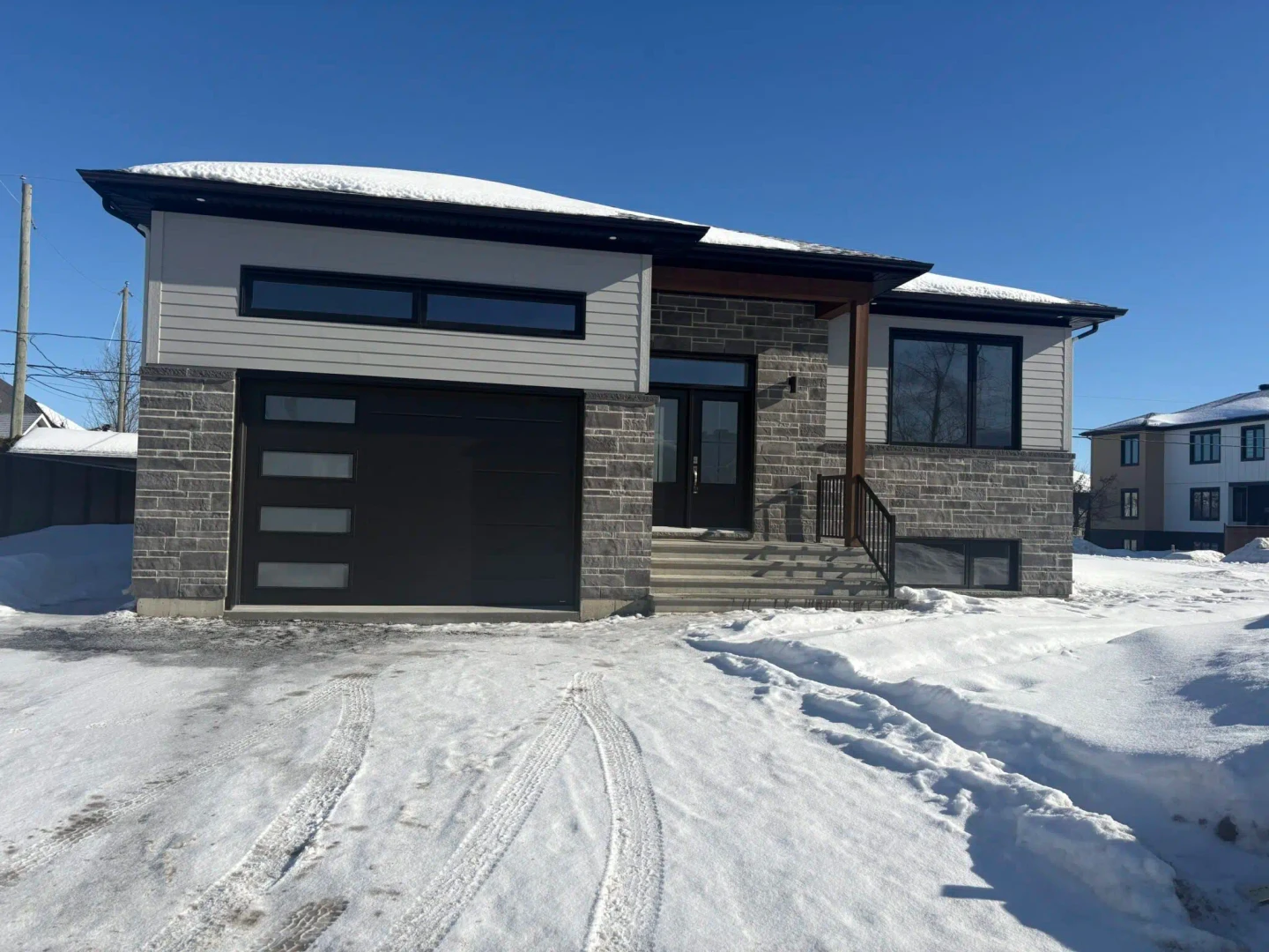This new single-family home with garage is located in Drummondville. It offers a modern living space with durable materials and functional layouts, including an integrated garage and optimized interior spaces.