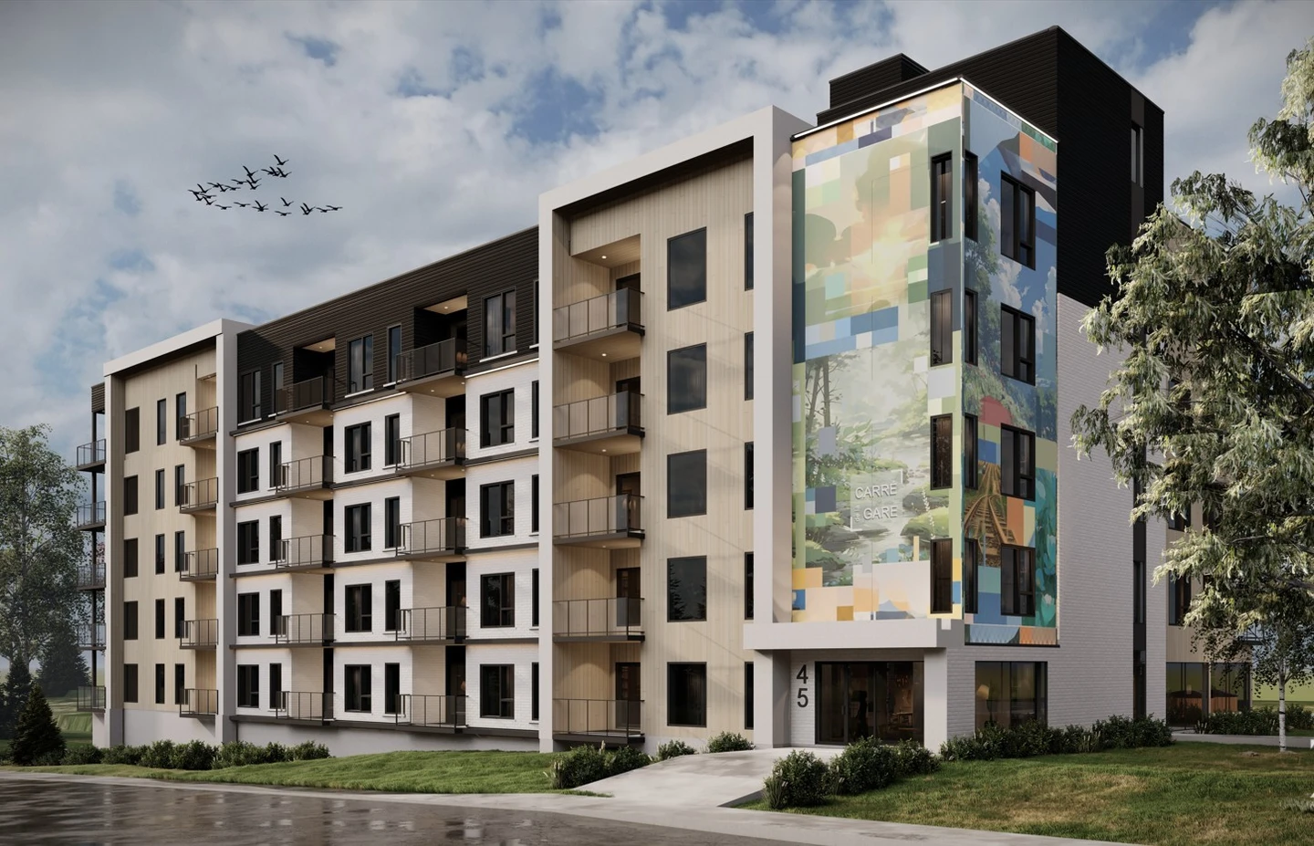 Situé au 45, 8e Avenue, Deux-Montagnes, Le Carré de la Gare est un projet résidentiel locatif développé par Habitations PHG.